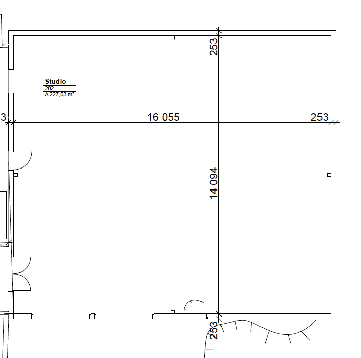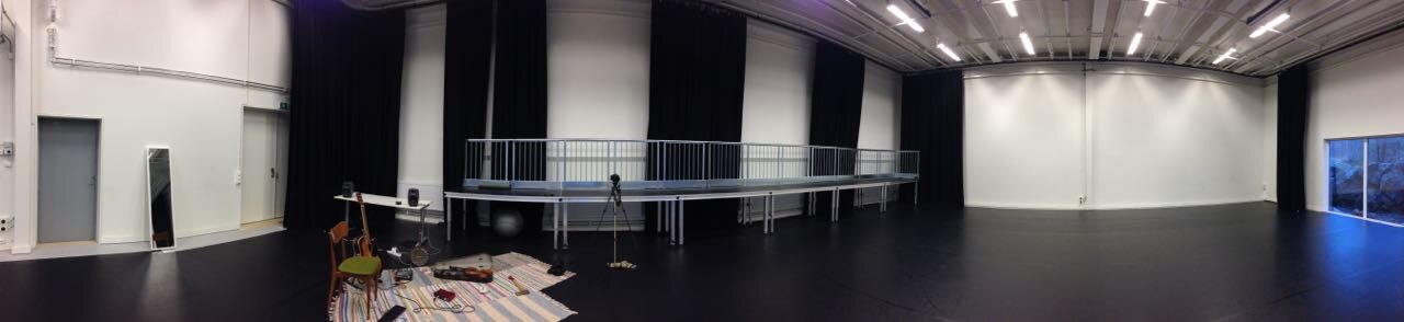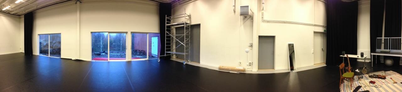 The studio is 16 m x 14 m (4.8 m high to the bars, 5.00 to the ceiling) with painted light grey wooden floor.