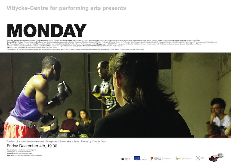 “Monday is the first of a set of seven creations of the project Seven Years Seven Pieces. This project is based on the idea of the meeting between two people, myself and a guest artist. In this first creation, the guest artist is Pablo Fidalgo Lareo, with whom I share an historic and cultural background but not necessarily the same way of seeing the world. Thus, Monday is a meeting where con-flict is not only present but also constitutes the generator of new ideas. The piece is structured in a boxing match – 12 rounds where words and bodies collide.” Cláudia Dias