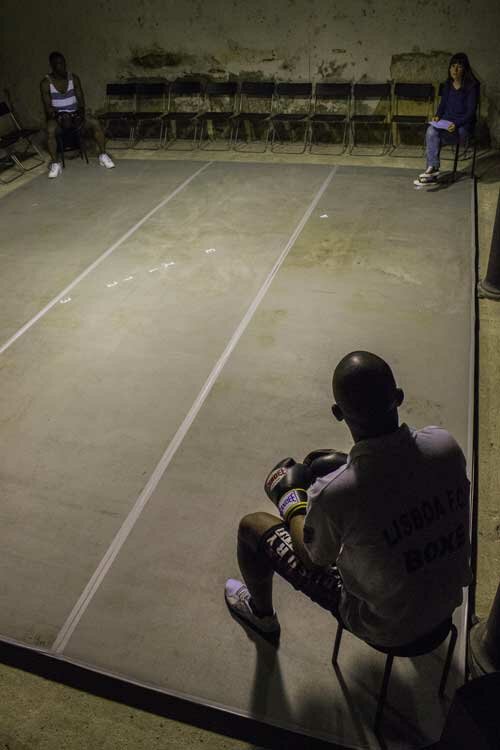 The first version of the duel between Pablo and Cláudia was rehearsed before an audience held in suspense last May, in an improvised boxing ring at Espaço Alkantara. Each round of questions between Pablo and Cláudia was followed by a round between two boxers of African origin, black like in the movies. The confrontation between europes was there, in the flesh, not just between whites and blacks, rich and poor, men and women, intellectuals and blue-collar workers, the Portuguese and the Spanish, but above all between spirit and matter, the false opposition that must be resolved. When will we begin to speak of ourselves in the plural? Who are we against? Who is the other? The two artists’ invectives will not fall