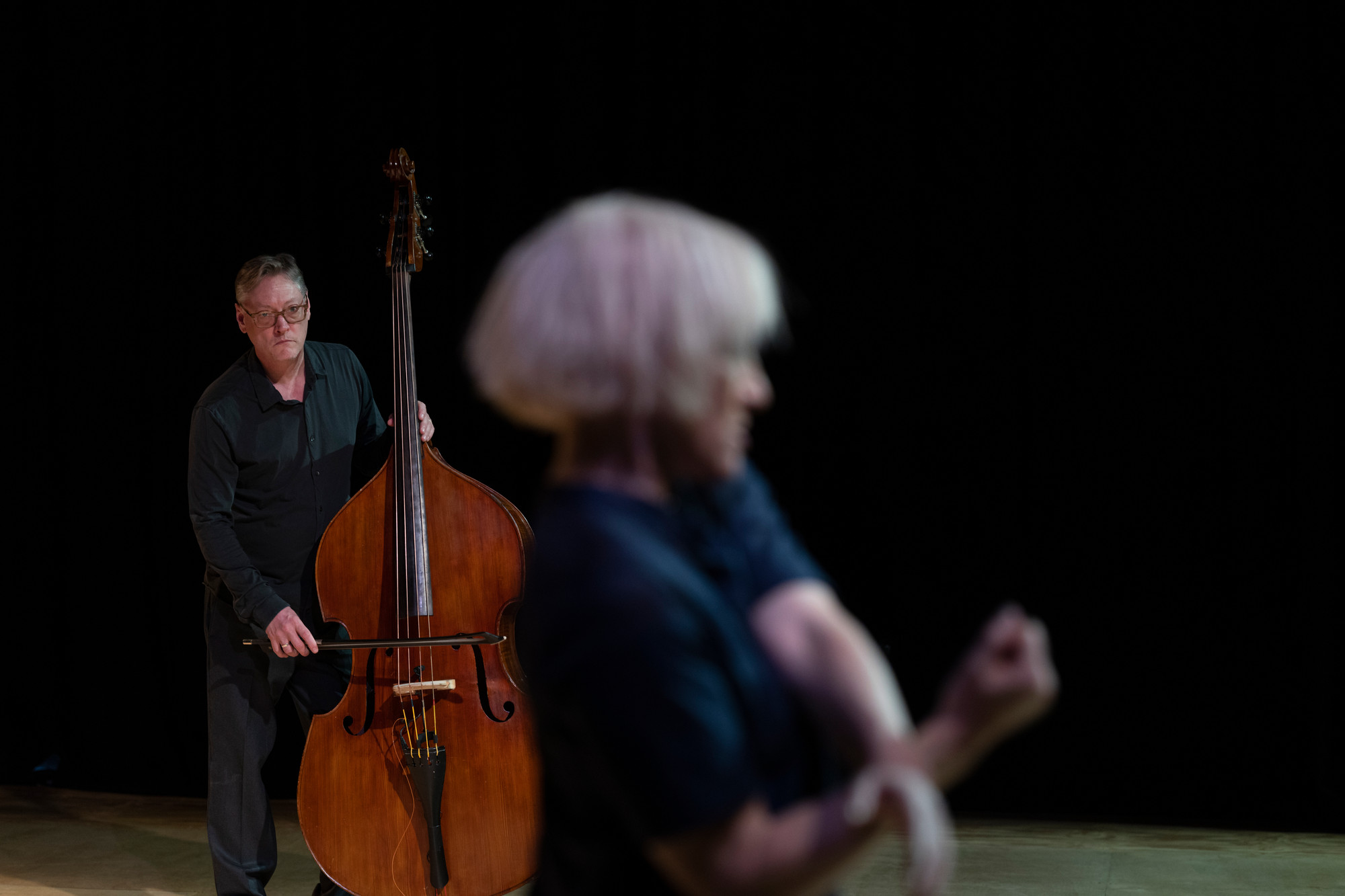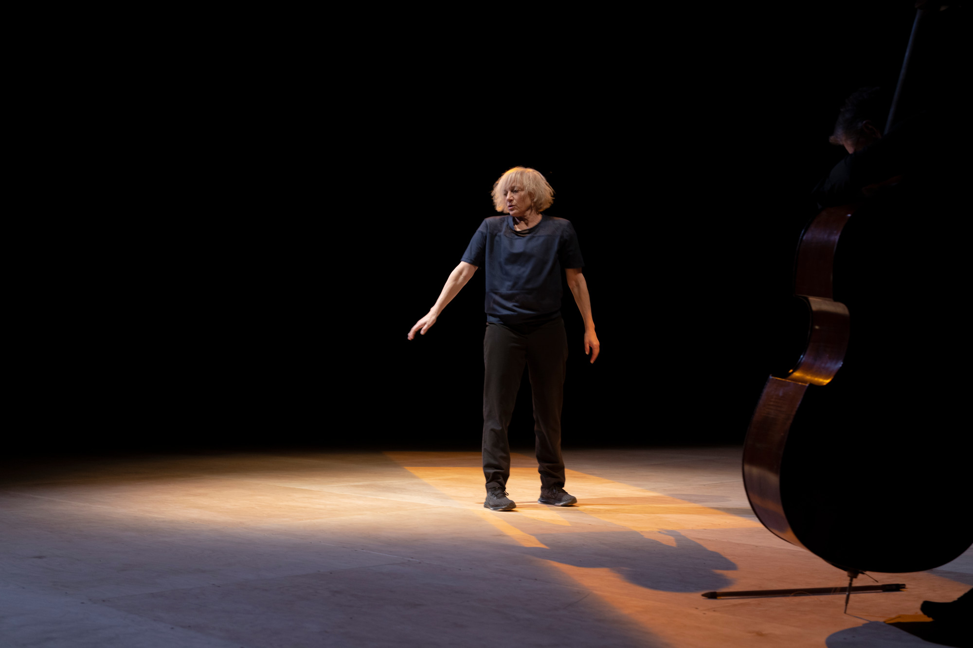 In an intimate concert setting, choreographer and dancer Meg Stuart meets jazz musician Doug Weiss. Together, they go on an uncharted journey into movement and sound. All the Way Around starts with the ballad, a song of longing and defiance, and breaks it down into small but meaningful gestures. Tracing and unfurling spirals of memory, All the Way Around takes a deep dive into what was, riding the waves between the almost-remembered and the unknown.