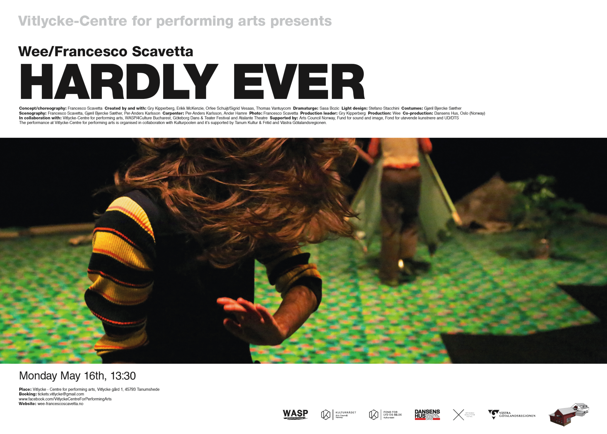“Hardly ever” explores the notion of truth and lies in theatre and everyday experience, bringing forward an investigation started with “Sincerely yours” (2008-09). The work plays with the gap between creating expectations and allowing the unexpected. Presenting the juxtaposition of physical responses to verbal statements, where the slight mismatch opens for new associations. Involving the body as cartography of the space and using the voice, singing and talking, with a significant text that informs with its meanings and affects for what it evokes.
